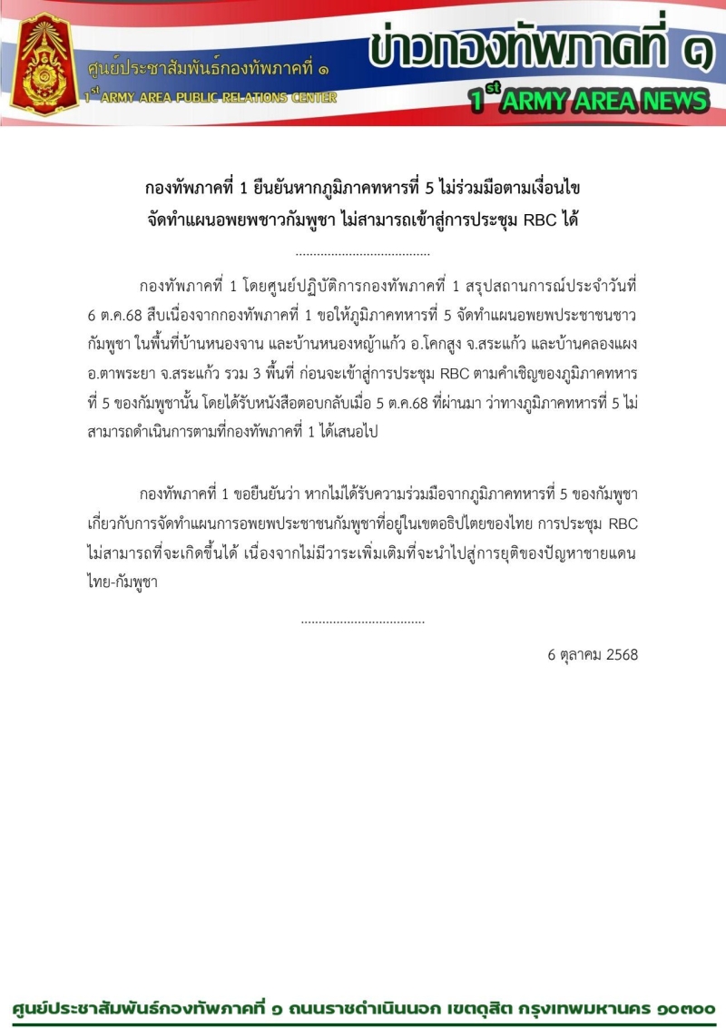 วันที่ 6 ต.ค.2568 ทางเพจกองทัพภาคที่ 1 ได้ออกมาแถลงการณ์กับประชาชน โดย ยืนยันหากกองทัพภูมิภาคทหารที่ 5 ไม่ร่วมมือตามเงื่อนไขจัดทำแผนอพยพชาวกัมพูชา ไม่สามารถเข้าสู่การประชุม RBC ได้